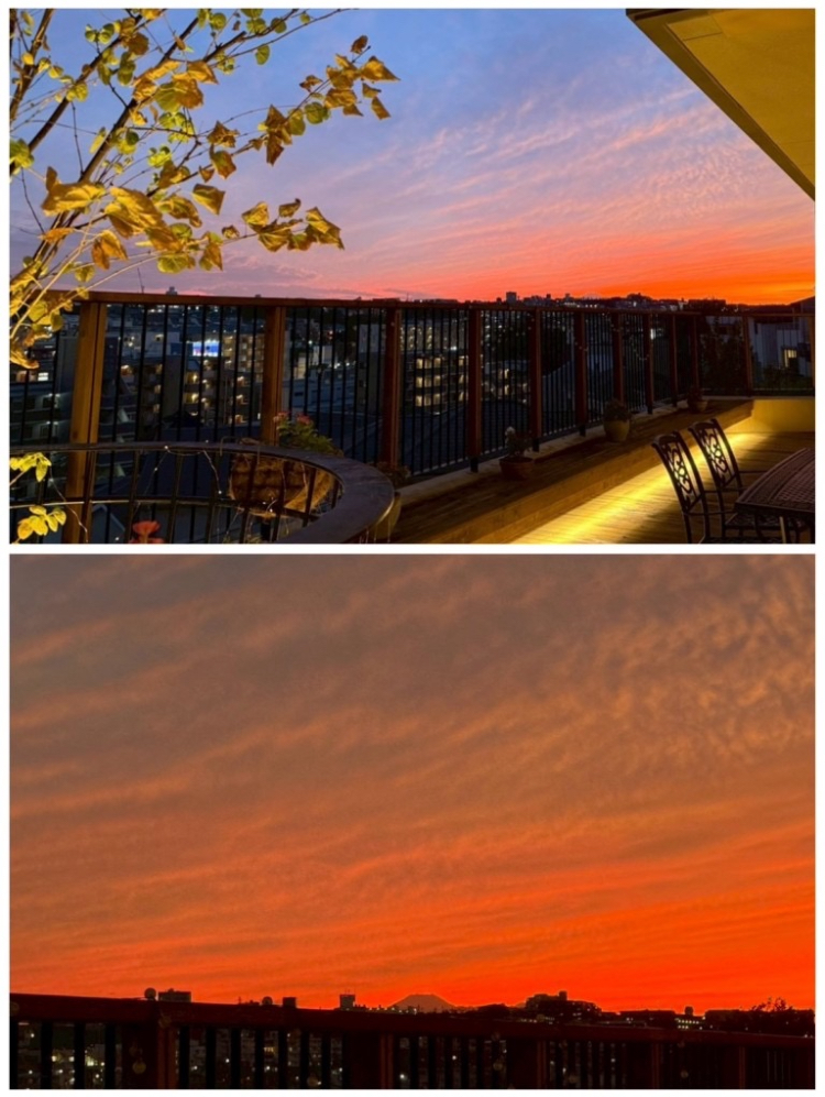 夕暮れ時には空がやさしいオレンジ色に染まり、富士山のシルエットがほのかに浮かび上がる光景は、