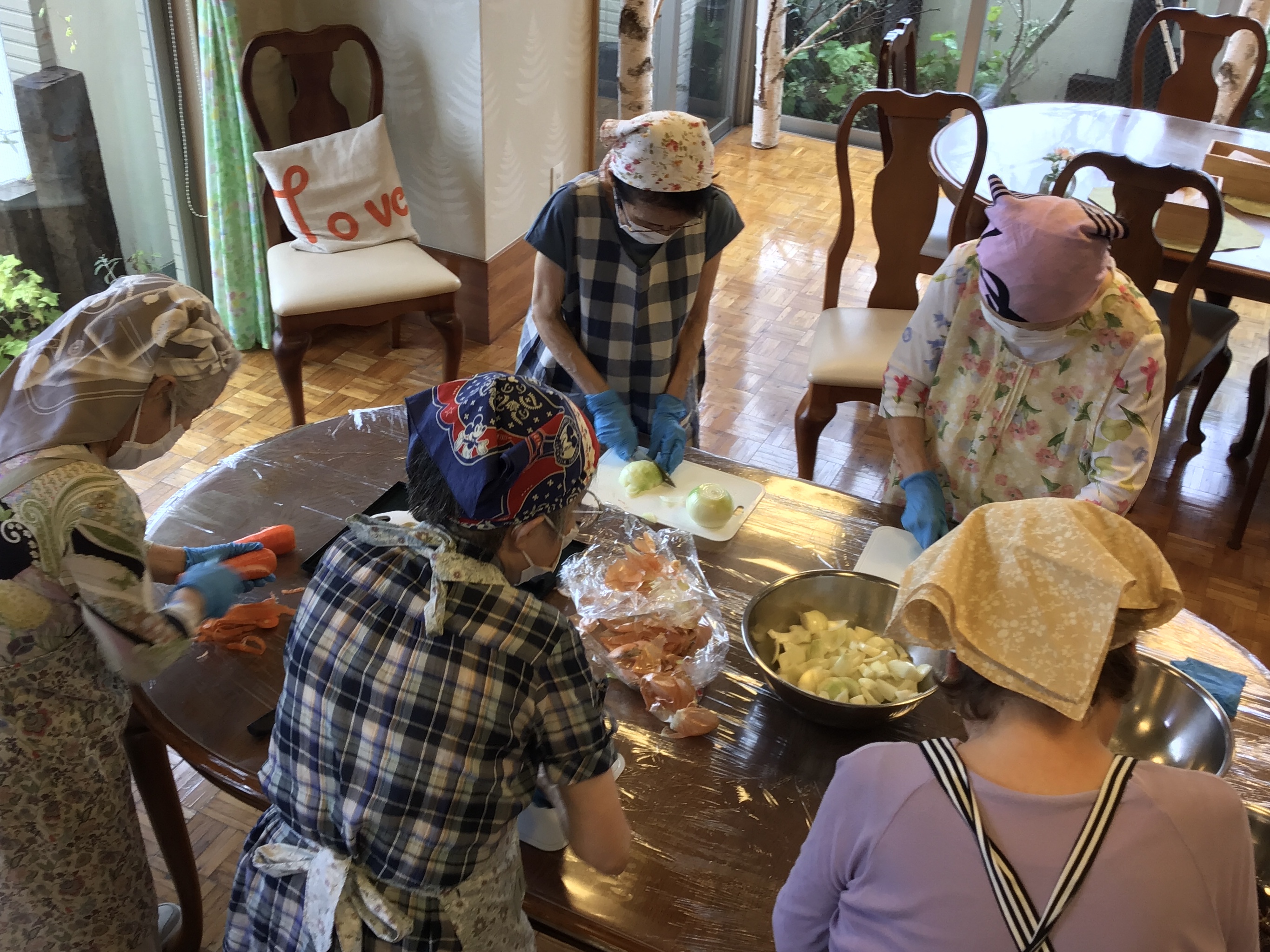 スタッフと一緒に近くのスーパーへ向かい、「今日はナスがきれいね」「カボチャも入れたら甘みが出るよ」と、買い物の段階からすでに笑顔があふれておりました