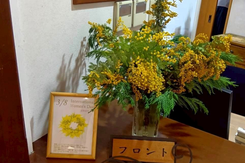 この日にちなみ、ホームのフロントには春の花「ミモザ」を飾りました。