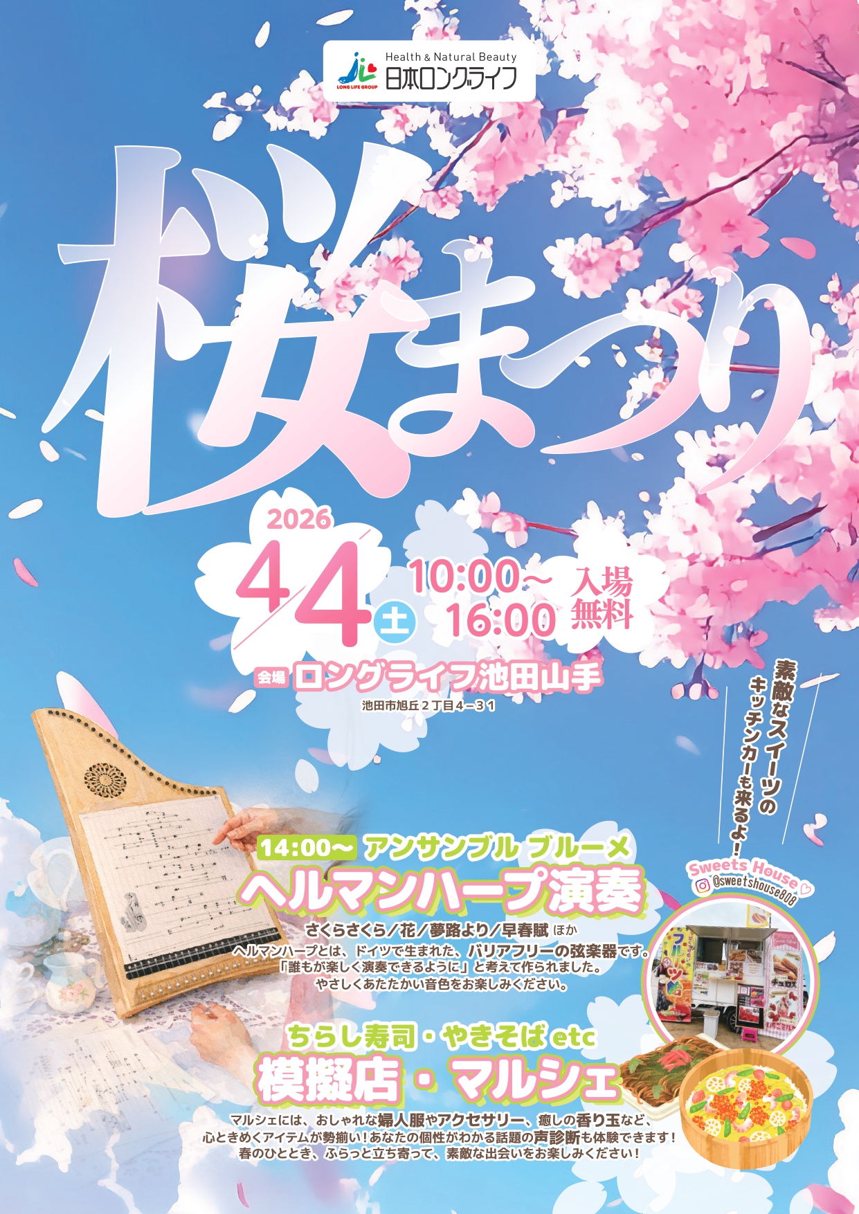 桜の季節にぴったりな、音楽・食・出会いがそろった贅沢な一日。「ちょっと行ってみようかな」そんな軽い気持ちで訪れても、きっと心が満たされるはずです。この春は、ロングライフ池田山手の桜まつりで、特別なひとときを過ごしてみませんか?🌸