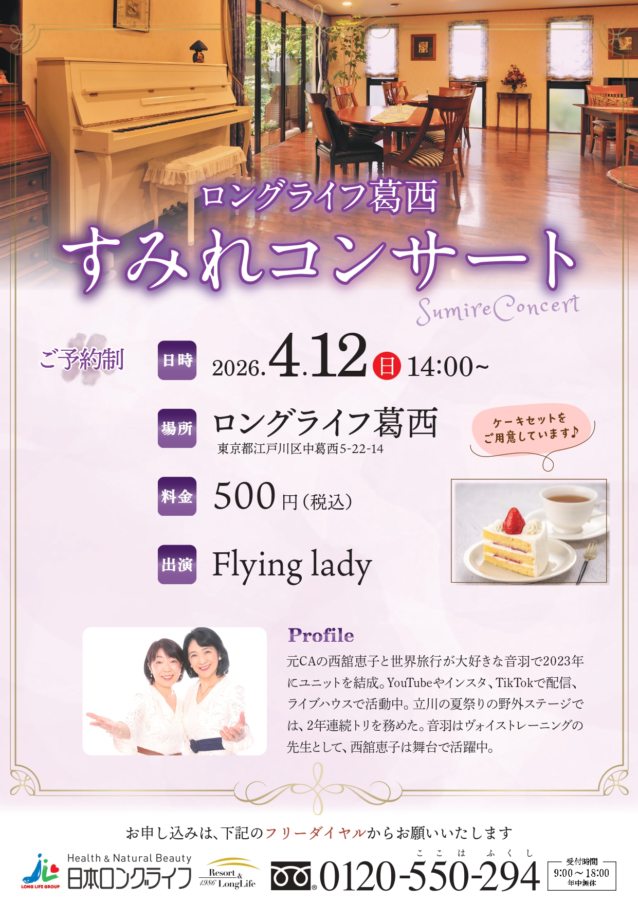 4月12日日曜日にすみれコンサートを開催させていただきます。音楽業界で幅広くご活躍されるFlying ladyをお迎えし、美しい歌声を聴きながら、優雅なひとときをお過ごしいただけます。この機会にぜひ「ロングライフ葛西」にお越しくださいませ。