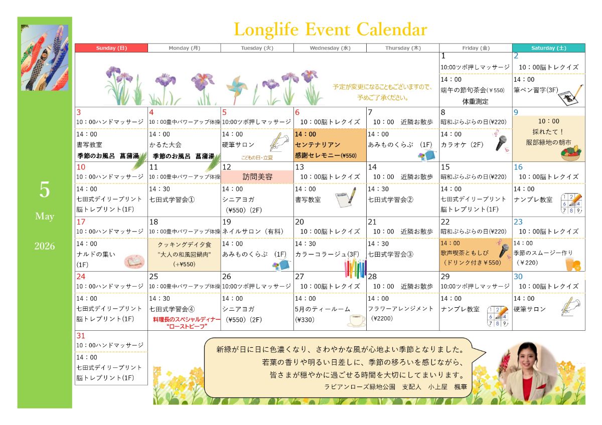緑地公園のすぐそば、自然に囲まれた「ラビアンローズ緑地公園」では、5月も季節を感じるイベントが盛りだくさん🌿✨脳トレやヨガ、書写、カフェタイムなど、日々の暮らしに“楽しみ”がしっかり散りばめられています😊さらに、100歳をお祝いするセンテナリアン感謝セレモニーなど心あたたまるイベントも開催🎶自然の心地よさと、安心の暮らしが両立する環境🏡「どんな雰囲気なんだろう?」と思った方は、ぜひイベントに合わせて見学へ👀✨