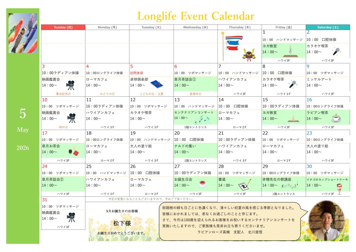 JR高槻駅からほど近い「ラビアンローズ高槻」では、5月もイベントが盛りだくさん🎏✨体操やカフェ、カラオケに加え、センテナリアンコンサートなど、毎日がちょっと楽しみになる時間が用意されています😊🎶24時間看護師常駐の安心感に加え、「暮らしを楽しむ」工夫が詰まったホームです🏡✨気になる方は、イベントに合わせた見学も大歓迎です!お気軽にお問合せください👀🌿