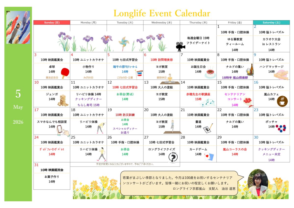京都右京区の住宅型有料老人ホーム、ロングライフ京都嵐山では、5月もイベントが盛りだくさん🎏✨映画鑑賞🎬やヨガ🧘♀️、お茶会🍵にコンサート🎶まで、毎日がちょっと楽しみになるスケジュールです「今日は何があるかな?」とワクワクしながら過ごせるのが魅力のひとつ🌸