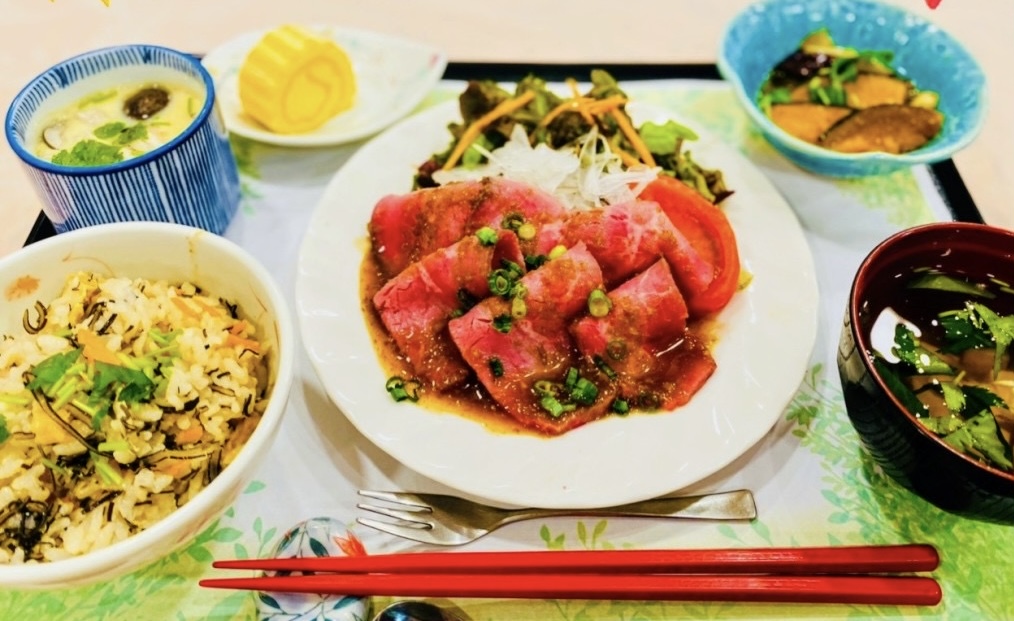 この日のメニューは、じっくりと焼き上げ旨味を閉じ込めたメインのローストビーフと、秋の訪れを感じさせるさつまいもご飯。香ばしい香りとやわらかな食感に、レストランは大きな笑顔に包まれました。