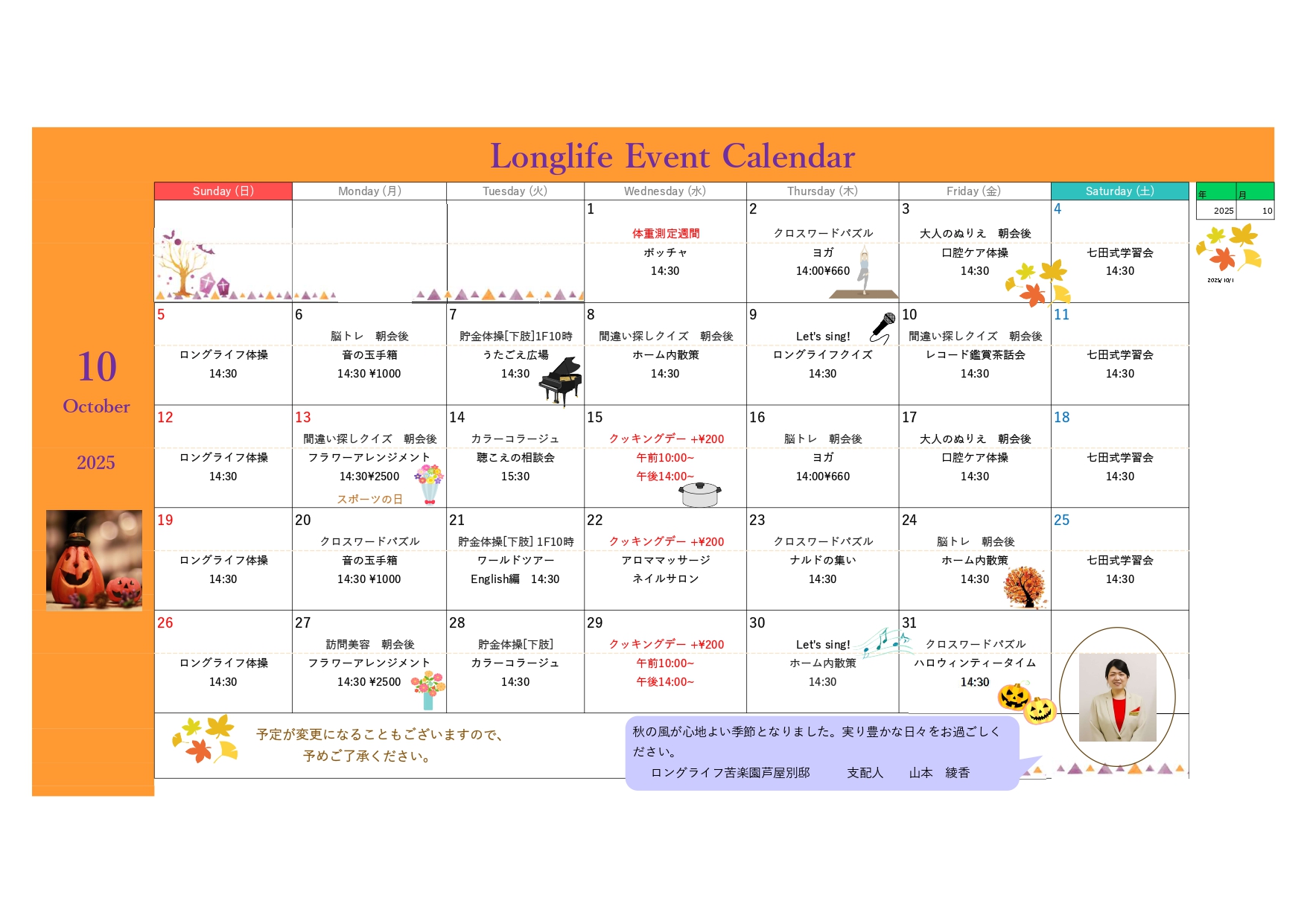 【芦屋・西宮】ロングライフ苦楽園芦屋別邸10月のイベントカレンダー🍂