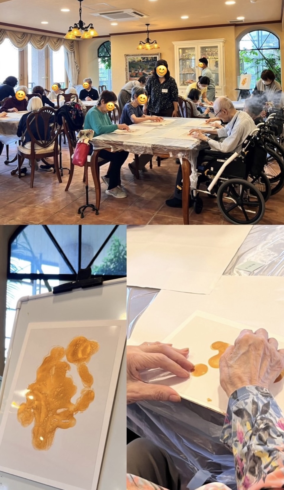 完成した作品はどれも個性が光り、お客様同士で「こんな色ができたよ」「面白い表現だね」と、会話も弾んでいらっしゃいました😊 認知症予防にも繋がるこのプログラムは、心と脳を活性化するとともに、新しい自分を発見する喜びにも満ちています。