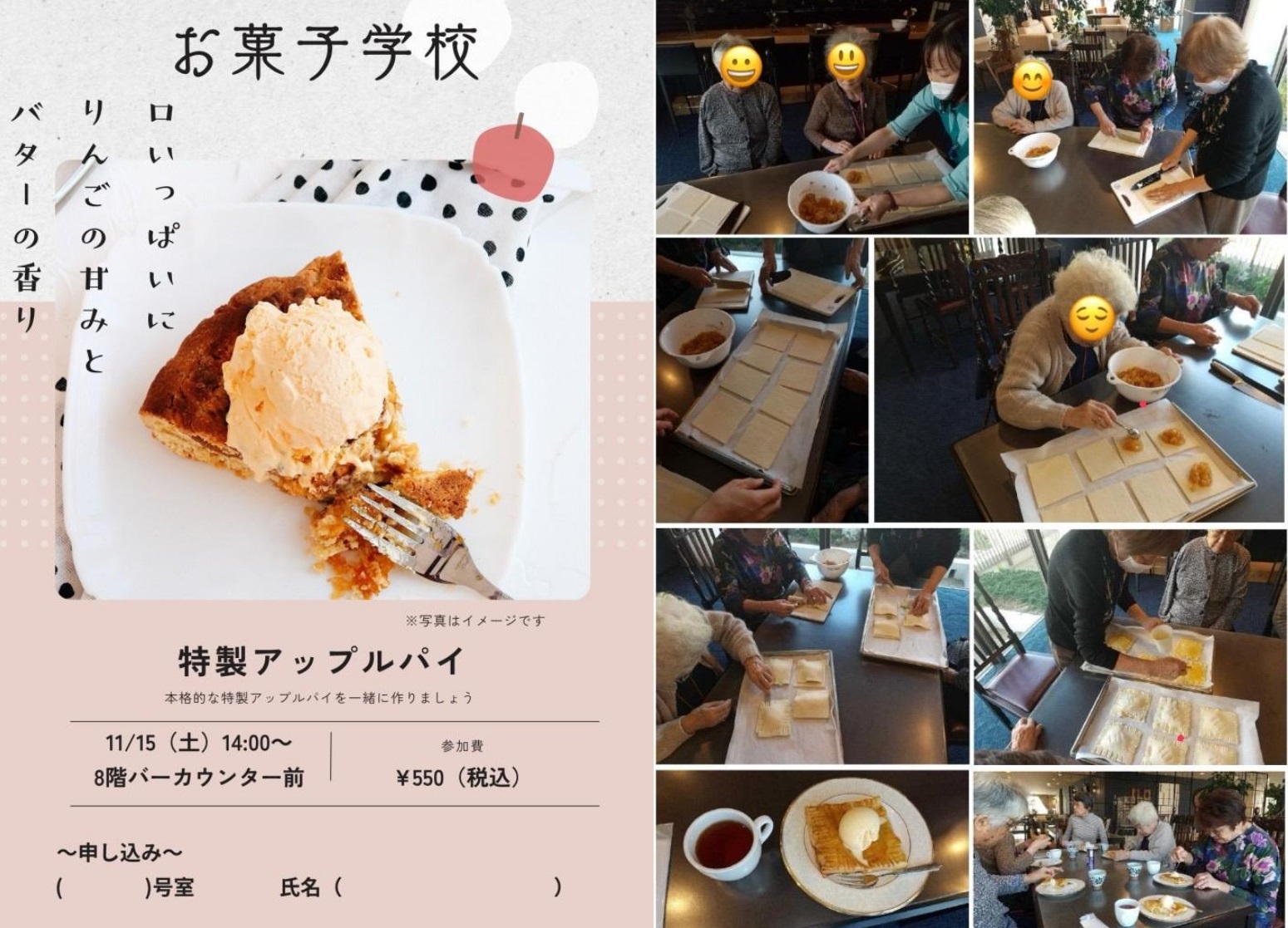 先日、8階レストランにて恒例の「お菓子学校」を開催し、今回は“アップルパイづくり”に挑戦していただきました✨