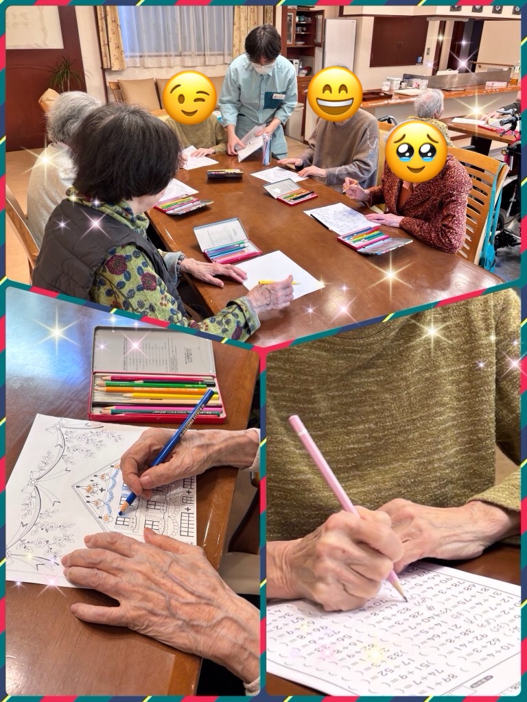 おやつのあとは、塗り絵や脳トレプリントにも取り組んでいただき、ゆったりとした午後のひとときを過ごしていただきました☺️