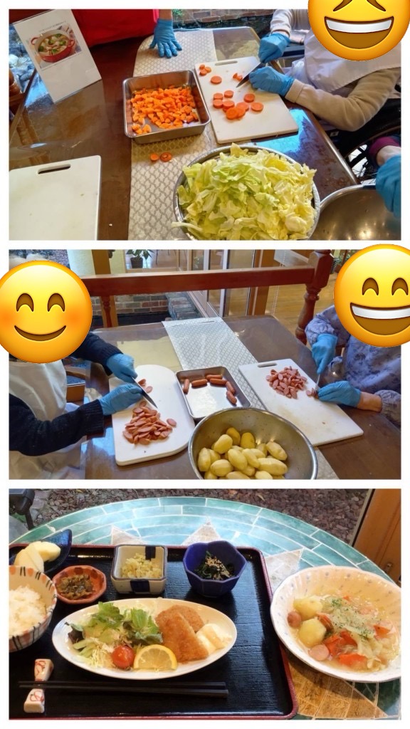 調理をしながら、「以前、洋食屋さんに外出した時に、山盛りのキャベツの千切りが出てきたのよ」「ソーセージを買っても、料理したことないわ」など、食材にまつわる思い出話で会話も弾み、終始にぎやかな雰囲気でした😊