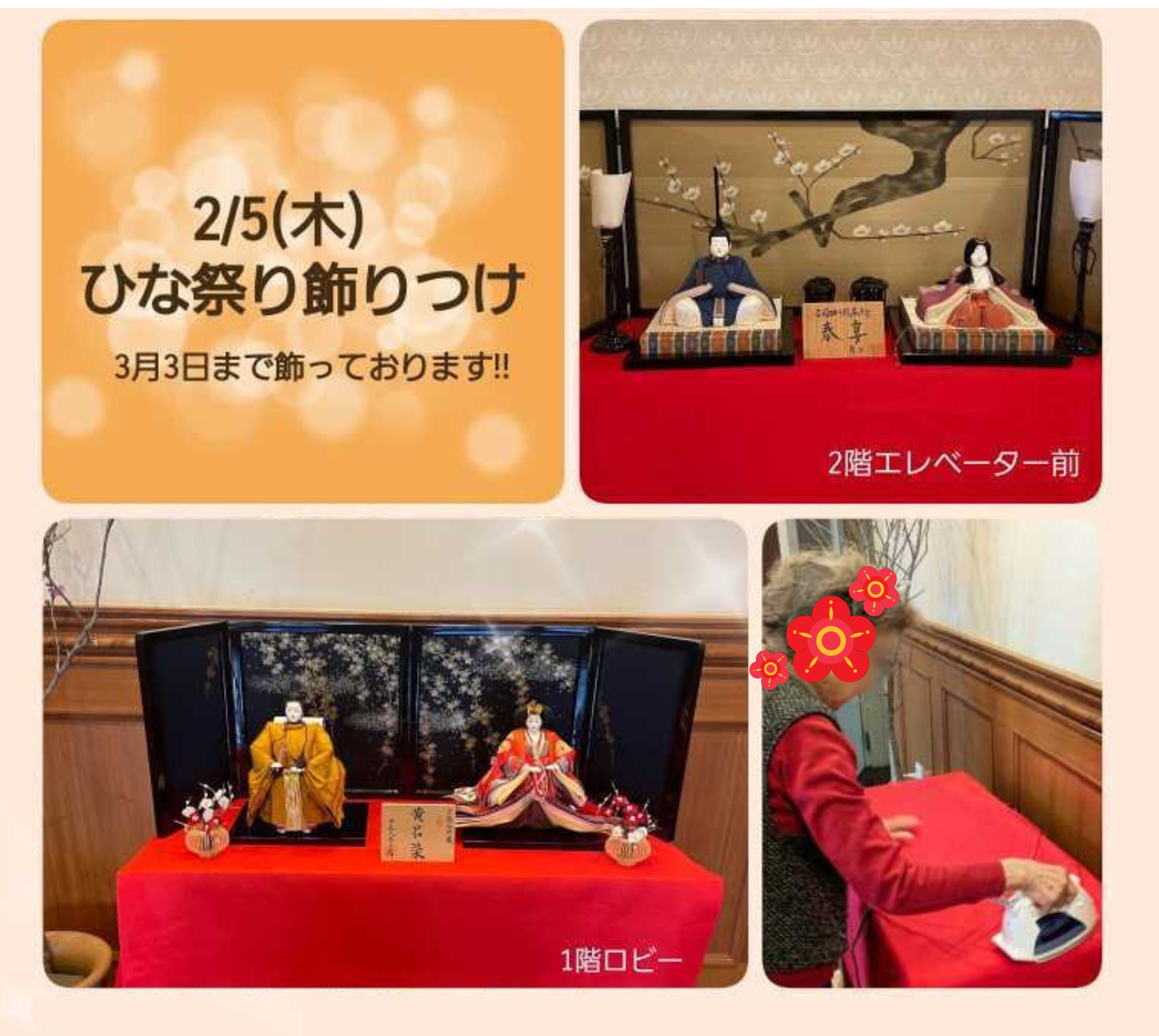 先日、ホームのロビーにて「ひな人形」の飾り付けを行いました🎎✨