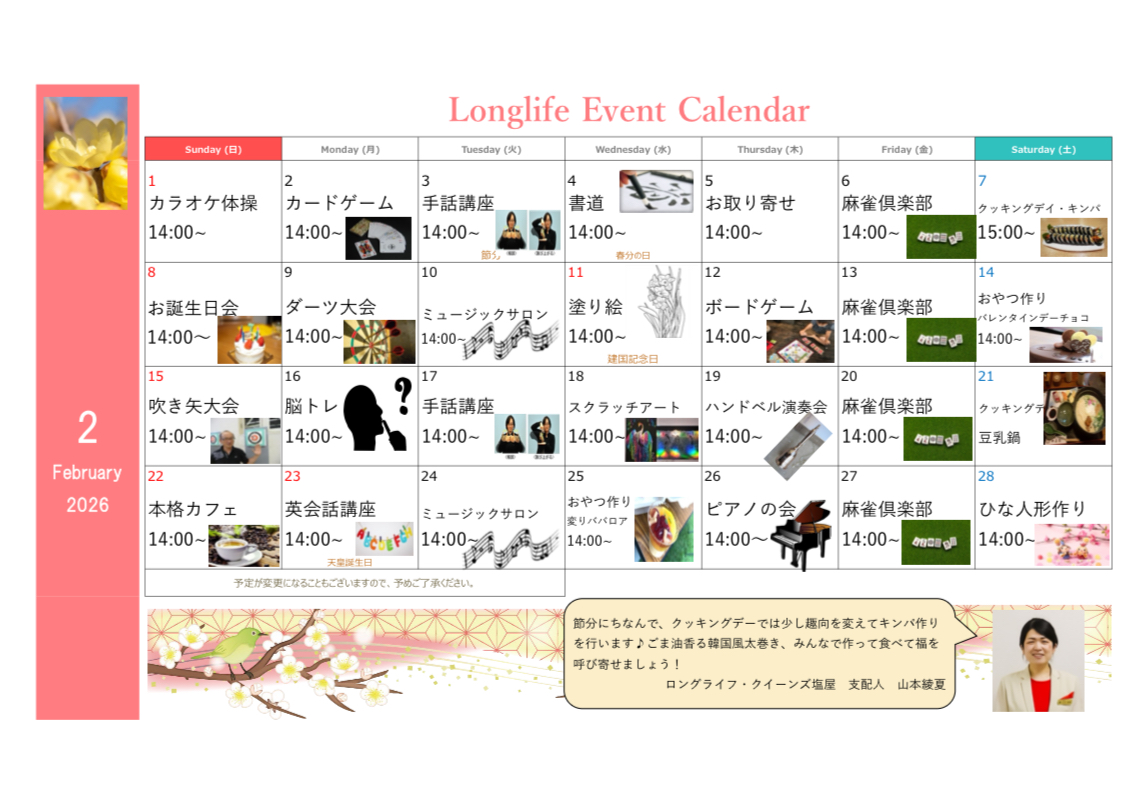 厳しい寒さの中にも、春の訪れが待ち遠しい季節となりました。今月、当ホームで予定している2つの体験型イベントをご紹介いたします。