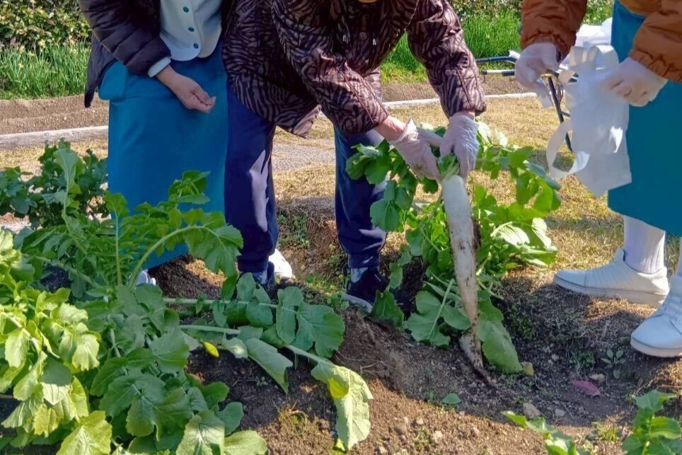 先日、隣の有料老人ホーム「ロングライフ上野芝」庭園で育てている大根の収穫を行いました。