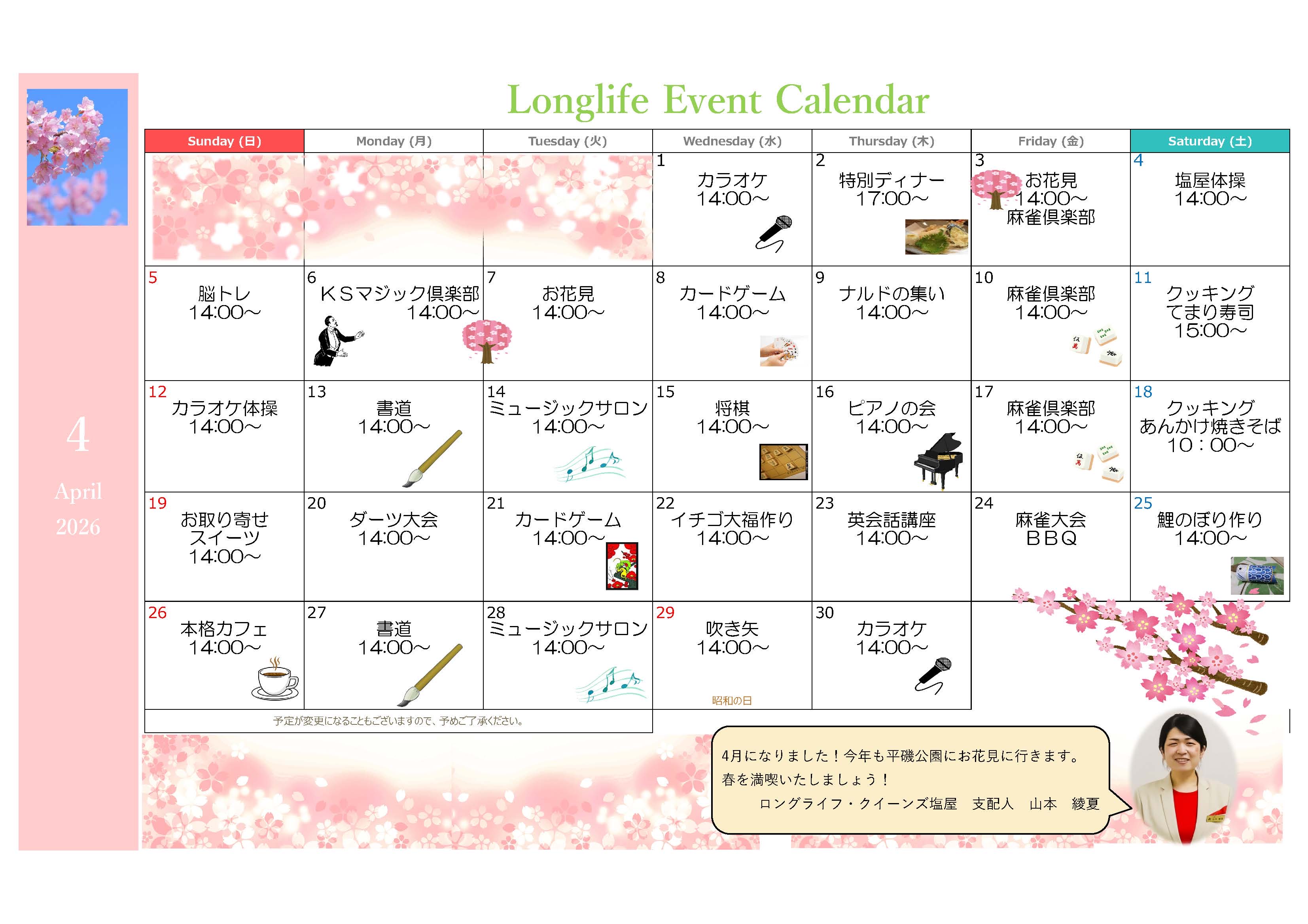 桜の便りが届き、春本番の暖かさが心地よい季節となりました。 4月のカレンダーより、注目のイベントを2つご紹介いたします。